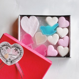 | 詰め合わせ内容 | ●干錦玉 青い鳥: 1個 ●和三盆 ハート:赤・白 各3個 ●干錦玉 ハート:4個 ●淡雪 ハート:1個 |