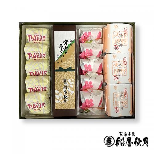 | 商品内容と賞味期限 | ●手づくり最中 北野天神(3個) :製造日より1ヶ月間 ●古都瓦(5個) :製造日より7日間 ●PARIS 巴里(5個) :製造日より20日間 ●抹茶羊羹 宇治の香ぐわし(1棹):製造日より1ヶ月間 【箱入り・包装】 |